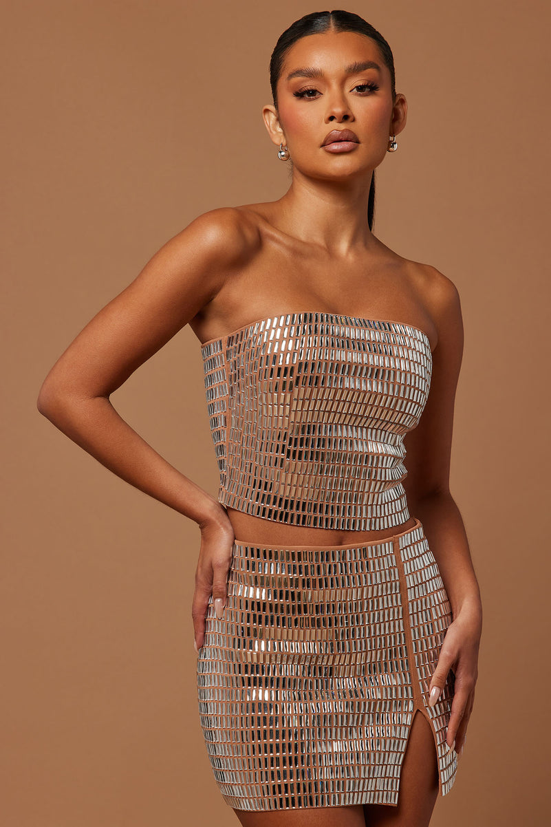• Tela semi stretch - Semi estiramiento • Conjunto de 2 piezas top y falda con detalles de cristales de imitación • Abertura frontal en falda • Cremallera trasera oculta • Forrado • Pieza: 92% Poliéster 8% Elastano • Forro: 100% Poliéster